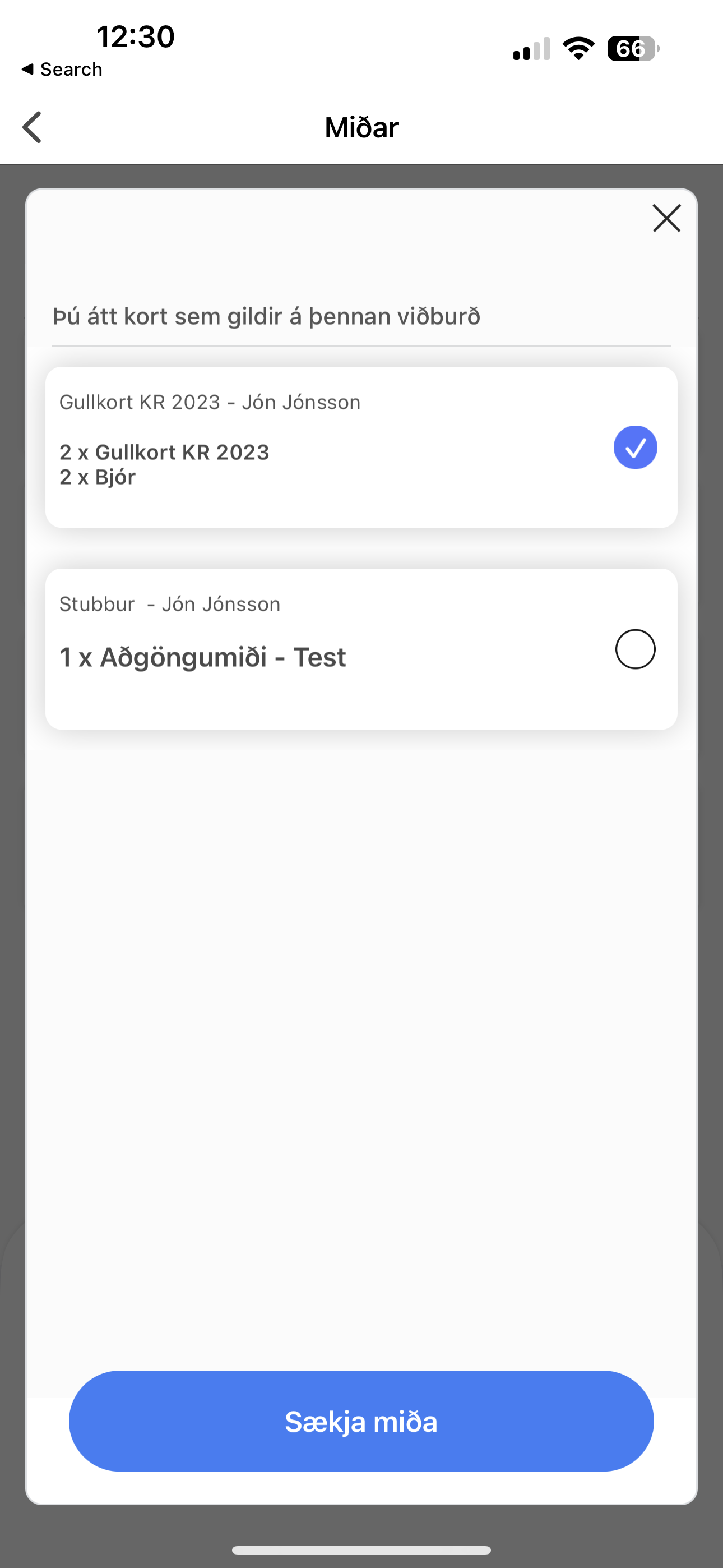 Ef það kemur ekki upp ný leið við að sækja miða þarf að fara í gegnum eftirfarandi skref:
